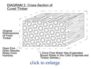 is Timber Effected by Humidity? Most materials, like metal and plastic, will not be affected by humidity, however, timber is extremely susceptible to humidity. The technical term for a material that is susceptible to humidity is ‘hygroscopic’. High humidity will cause mould to grow on many materials, especially leather. However, timber is one of the only materials that will actually expand with high humidity and contract with low humidity. This is due to the fact that living vegetation holds water in its cells naturally. When the tree is felled and the timber is dried or cured the ‘free water’ contained in the cells will evaporate first. After the free water has totally evaporated more water will evaporate from the actual cells themselves this water is called ‘bound water’. During this stage the timber will actually shrink until the timber is totally cured and ready for use (see Diagram 1 & 2). This timber will still continue to absorb water in high humidity and lose water in low humidity. This absorption will mostly take place though the ‘end grain’ as the cells of the timber are open and porous at the ends of a piece of timber.